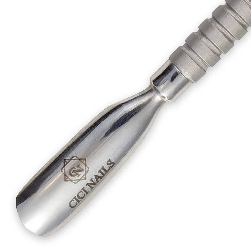 Entdecken Sie das hochwertige Profi-Tool für präzise und effektive Nagelhaut- und Nagelplattenpflege. Dieses 2-in-1-Multifunktionsgerät kombiniert einen breiten, leicht abgerundeten Nagelhautschieber (Pusher) mit einem präzise gebogenen Schaber (Kireta) und bietet alles, was Sie für eine perfekte Nagelvorbereitung in der Pediküre benötigen.